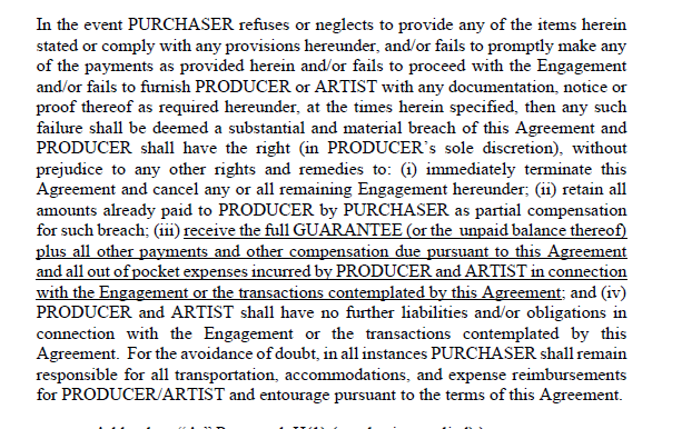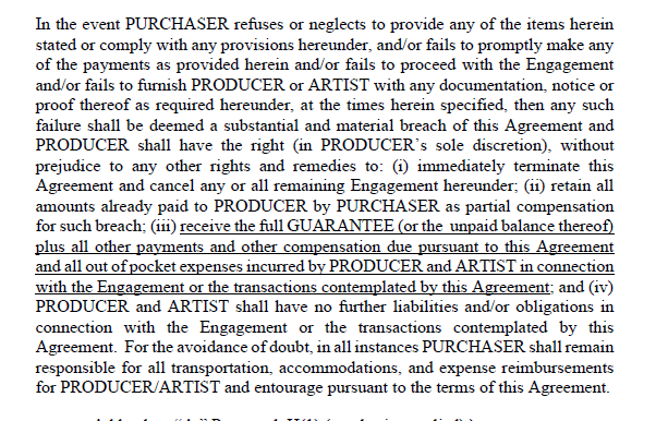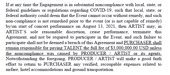 In short, if the contracted for event were to be deemed unsafe and impossible due to the resurgence of COVID, this provision says that it does not matter. The band, in their “sole reasonable discretion,” can terminate the obligation and refuse to perform…and still get paid.