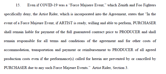 Was COVID a “force majuere” event? The band says that they expressly removed the reference to COVID in that paragraph, and further allege this: